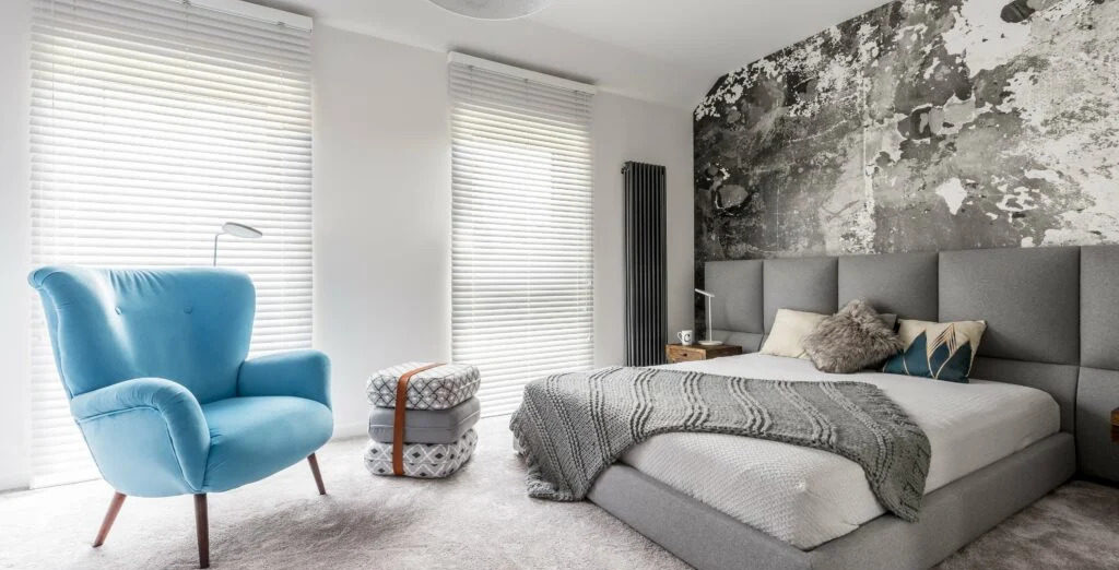 - Choose a plush wool or cotton carpet with minimalistic patterns and earthy tones to complement your bed’s linen and accent pillows.